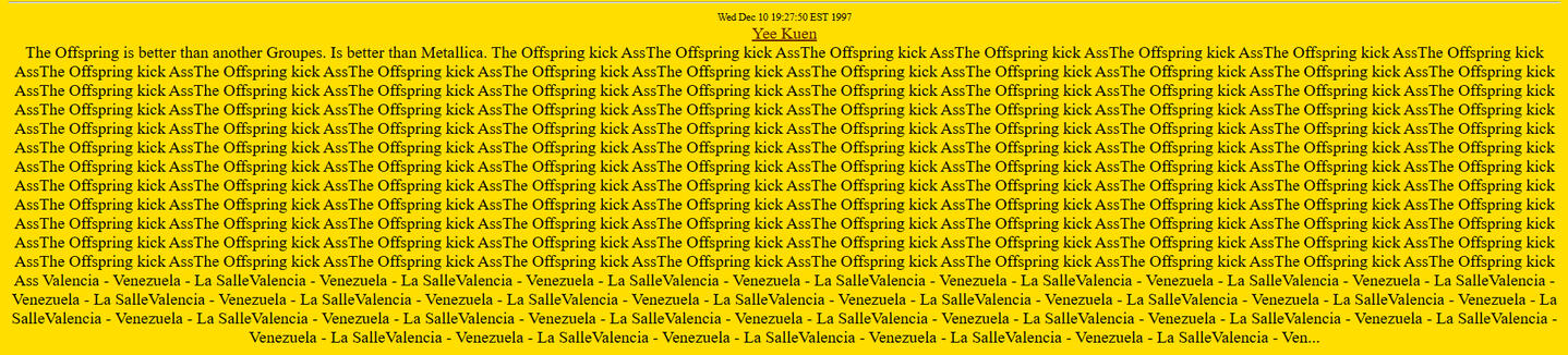 Hmmm Nice little Message you have there Nicole. About Hanson are good and Offspring Are gay... Let me remind you extract: Like oh my god. WALLYCHICK, YOU ARE SUCH A MOTHERFUCKIN BITCH. I THINK YOU SHOULD GIVE HANSON A CHANCE. THEIR MUSIC IS FULL OF POSITIVE MESSAGES. AND BY THE WAY, HANSON IS SO NOT GAY. IF ANYONE'S GAY ITS THE OFFSPRING. ALL OFFSPRING FANS SHOULD ROT IN HELL!!!!! YAY SPICE GIRLS!!!!!!!!!!!!!!!!!!!!!!!!! E-MAIL ME, YOU SACKS OF GODDAMN SHIT!!!!!!!!!!!!!!!!!!!!!!!!!!!!!! [email protected]....... [email protected]........... [email protected]............. [email protected].............. [email protected].............. [email protected].............. [email protected]............. [email protected].................. [email protected].................. [email protected]................ [email protected].................. ........................................................... .......................................................... ........................................................... ..................................................................................................................... ......................................................................................... .......................................................... E-MAIL ME YOU ILLITERATE PILES OF FUCKIN SHIT!!!!!!!!!!!!!!! I HAVEN'T GOT ONE HARASSING LETTER YET................LOSERS LOSERS LOSERS LOSERS LOSERS LOSERS LOSERS LOSERS LOSERS LOSERS LOSERS LOSERS LOSERS LOSERS LOSERS LOSERS LOSERS LOSERS LOSERS LOSERS LOSERS LOSERS LOSERS LOSRES LOSERS Now Nicole. People think what they want about Hanson and you think what you want about offspring. The truth is Offspring aren't gay at all, You dick cos Dexter is married and the others have Girlfriends. Hmm suck on that one.. ooh ohh Part 2... Hanson are gay because THEY DON'T have any relations with girls at all. And come on think about it. Hanson songs having meaning??? Let me remind you yet again extract of lyrics: Mmm bop.... Doo wop.....Mmm bop Yeah .... Is that enough. Fine I don't care if you listen to Hanson and don't like Offspring the thing is that you get on and abuse them and especially That list of "asswipes" as you called them had my friends Name in it. Now if I ever meet you in offspring Chat I will BOOT you on sight. Unless you do some serious Sucking up on the Graffiti Wall. .Your Choice. I will be waiting for your Tag on the Wall.. .... P@g@nlord......... p.s. Hmm about you calling others Illiterate. Look at yourself first, bitch. You spelt the word Asswipe as Asswhipes... No "h" Bitch. Get it right Next time.